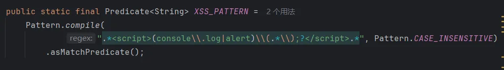 这是一个大小写不敏感,严格匹配 <script>...</script> 结构以及只判断alert和console.log()两个特定函数的用于XSS过滤的正则表达式