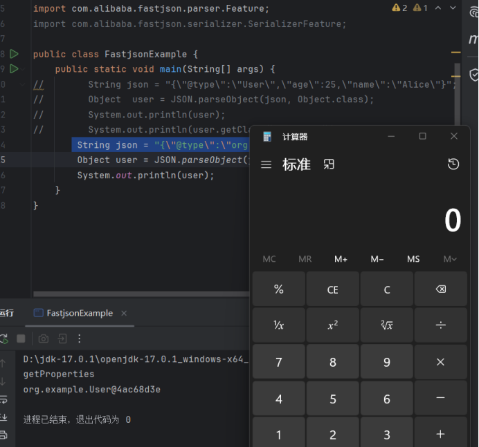 这里是把json反序列化为User类,那么当然User类的类型越大,可利用空间就越多,如果是Object类,由于Object类是任意类的父类,所以就可以反序列化出所有类