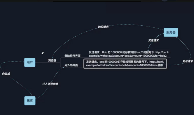 攻击者利用已登录的用户的身份,通过诱导用户点击链接或者提交表单,来执行一些非用户本意的操作。这种攻击通常发生在用户已经与网站建立了信任关系(例如登录状态)的情况下。