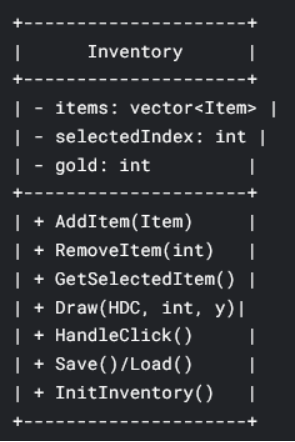o 示例:Inventory类封装物品管理、UI 绘制和数据持久化,通过AddItem/RemoveItem接口与其他模块交互。