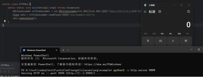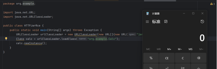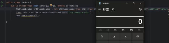 URLClassLoader urlClassLoader = new URLClassLoader(new URL[]{new URL("jar:file:///D:\\text\\codeqltext2\\untitled\\target\\classes\\org\\example\\Calc.jar!/")});