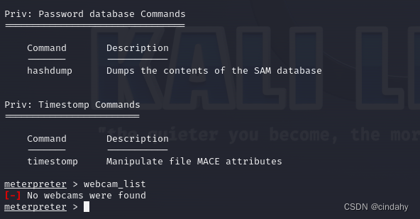如查看靶机的网络摄像头情况,输入webcam_list,这里可以看到没有摄像头。
