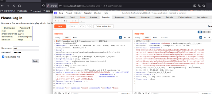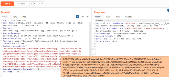 在登录时选择了记住我会返回一个rememberme的头,在rememberme的头后面赋任意值会返回一个 rememberMe=deleteMe。说明目标有使用shrio框架