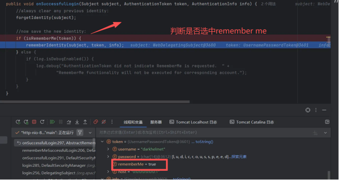 访问对应的登录页面,选中remember me之后,如果登录成功,服务器的cookie的remeberme字段下的值会返回一段字符串。