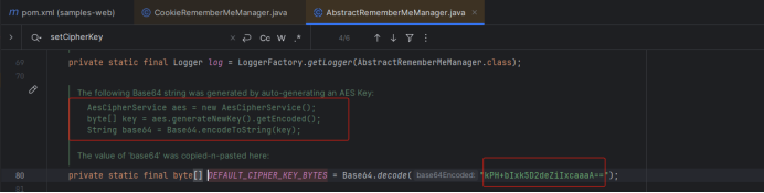 总的来说是利用rememberme中的base64解码+AES解码之后会触发反序列化的逻辑,将恶意代码编码构造好之后替换原来的rememberme,最后在反序列化时触发恶意代码。