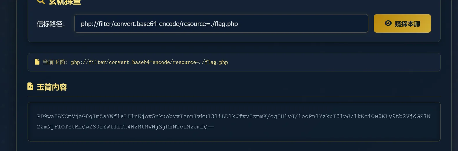 因为此文件是一个php文件,解释器会自动执行它,所以返回的并不是一个源文件,而是一个执行结果,所以我们如果要看到php文件的源码就需要php://filter/convert.base64-encode/resource=