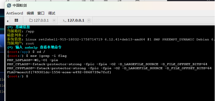 这个payload是跑得通的,再把相应的命令换一下找到flag,这里的flag在环境信息里,比如下面的
