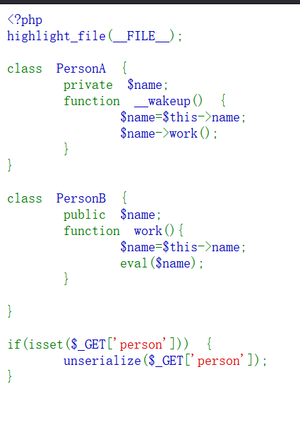 $c->name = "file_get_contents"; // PersonC::check 中会调用这个可调用名 -> passthru("cat /flag")
