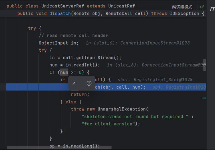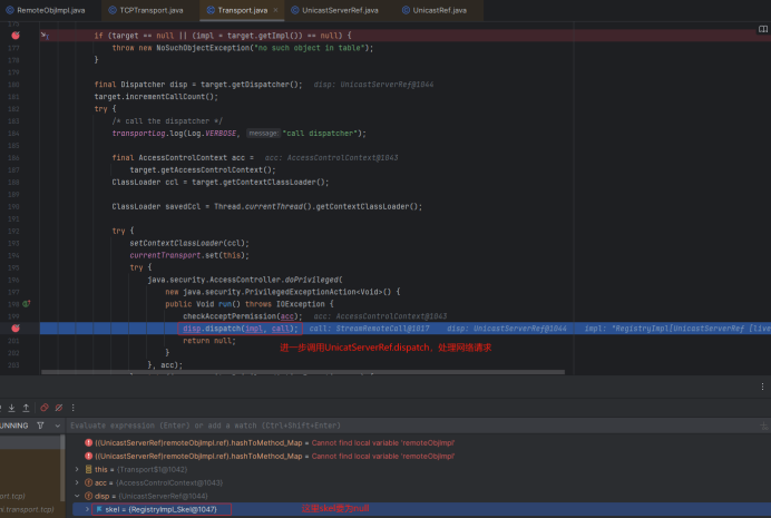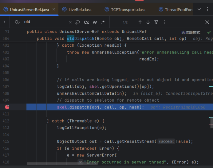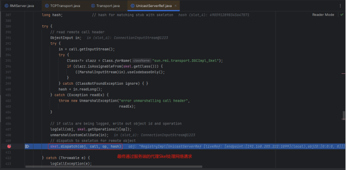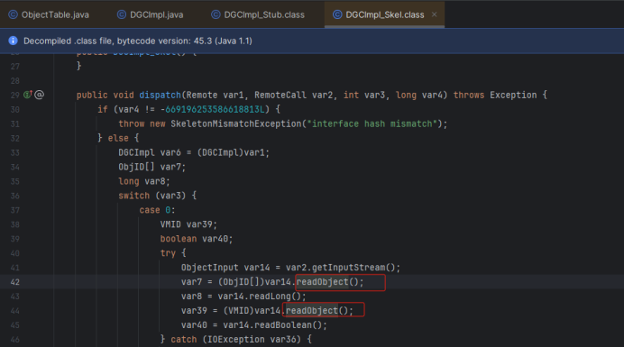总的来说是 RegistryImpl_Skel类调用了dispath方法,然后lookup方法中有一个反序列化的点,这里是存在漏洞的