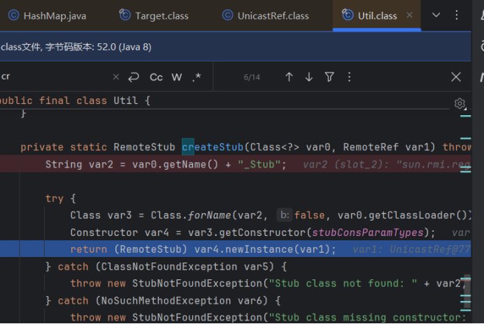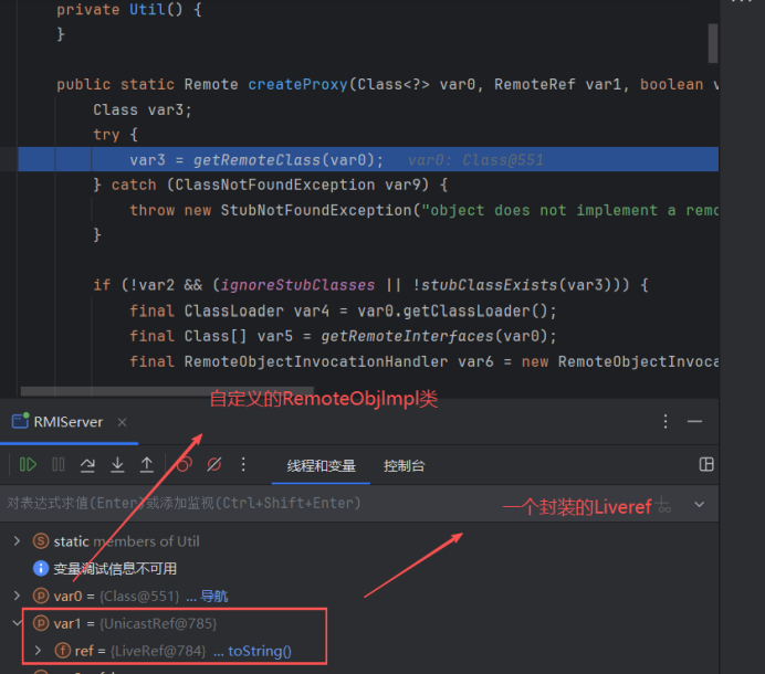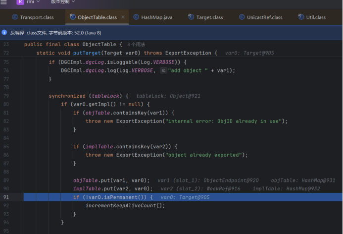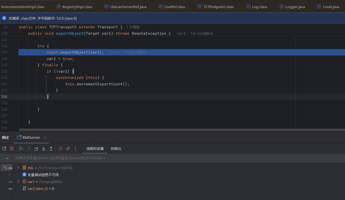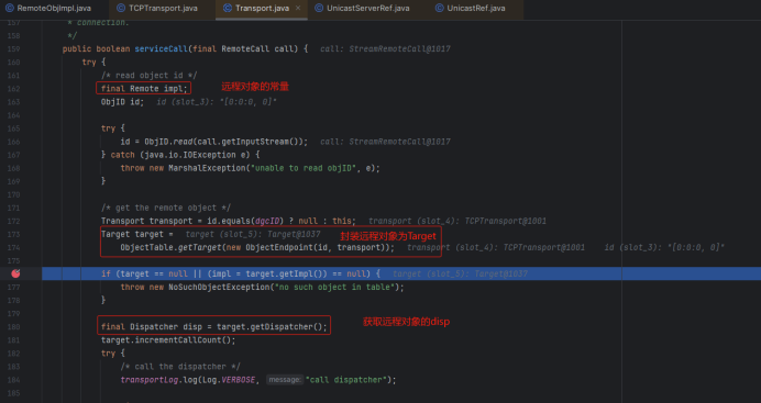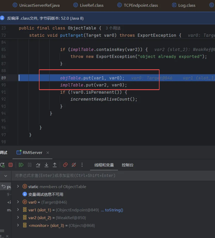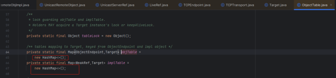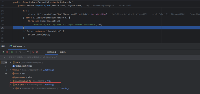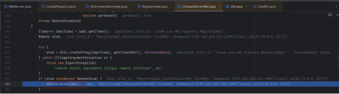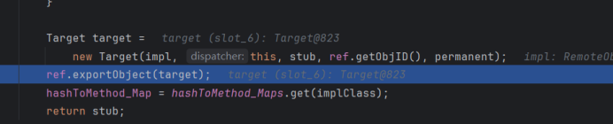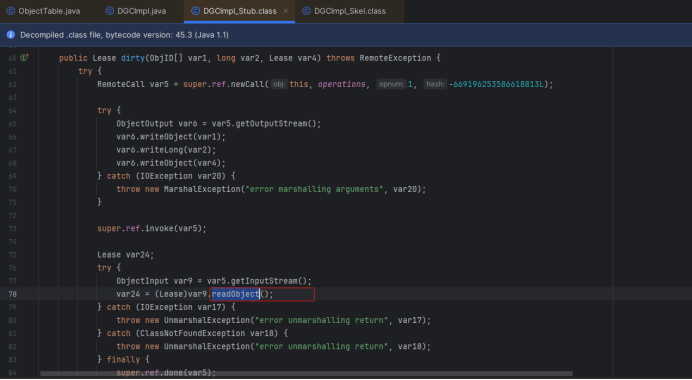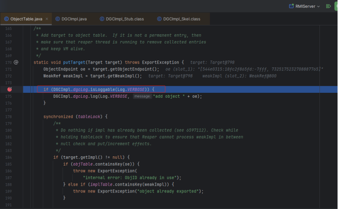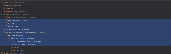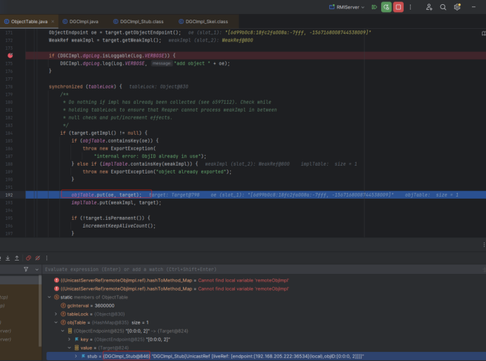 来到这里,可以发现static中的数据的 objTarget的第二个Target对象的Value的值有一个 DGCImpl_Stub。它是分布式垃圾回收的一个对象,并不是我们创建的,而且这里有三个Target后面会说到。