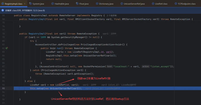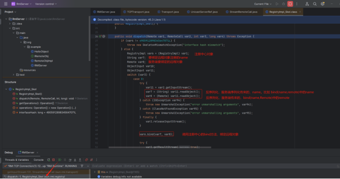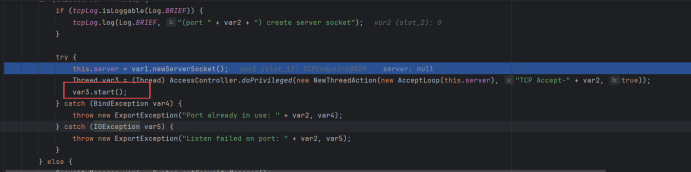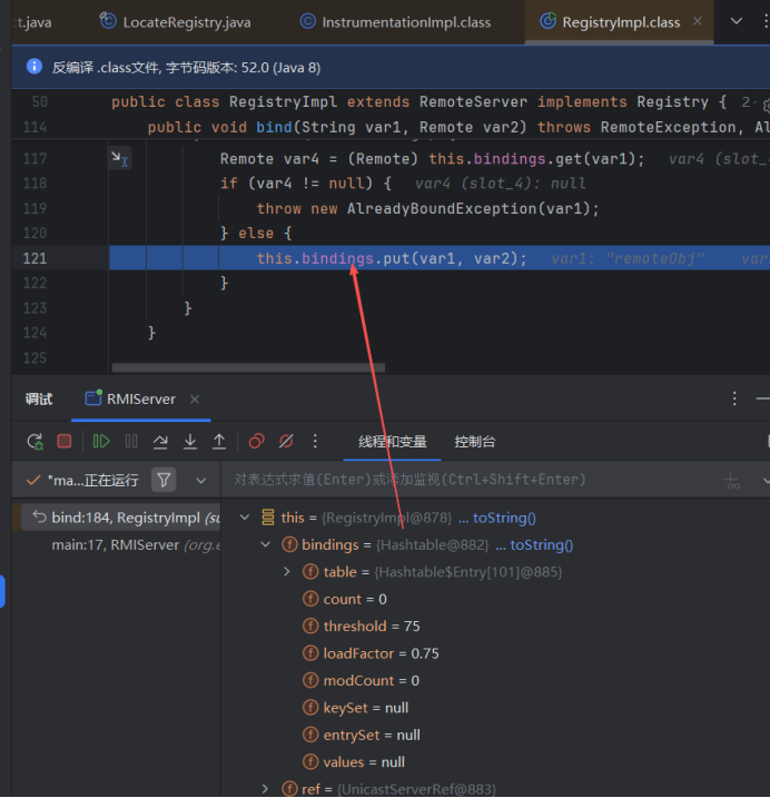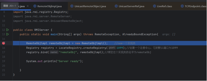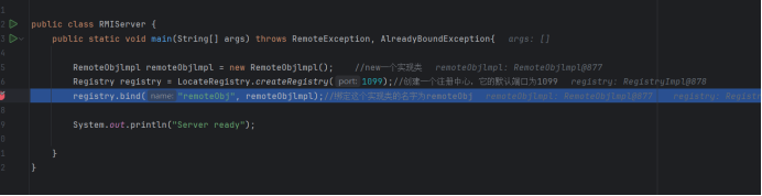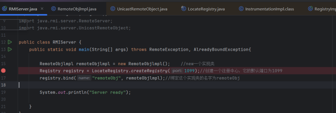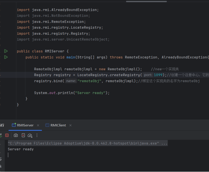 这部分代码创建了一个注册中心,它在1099端口监听,等待其他RMI服务(如我们的 RemoteObjlmpl