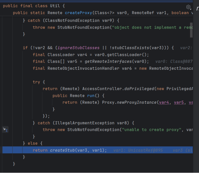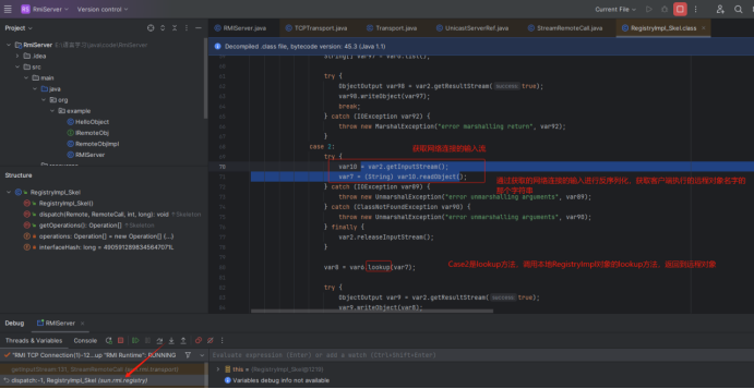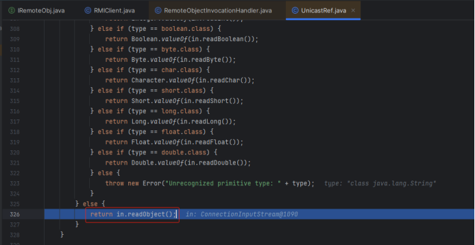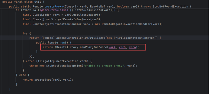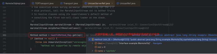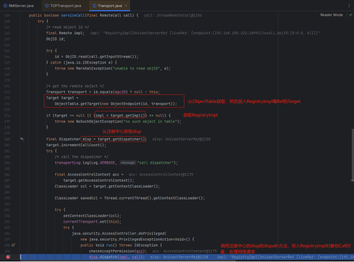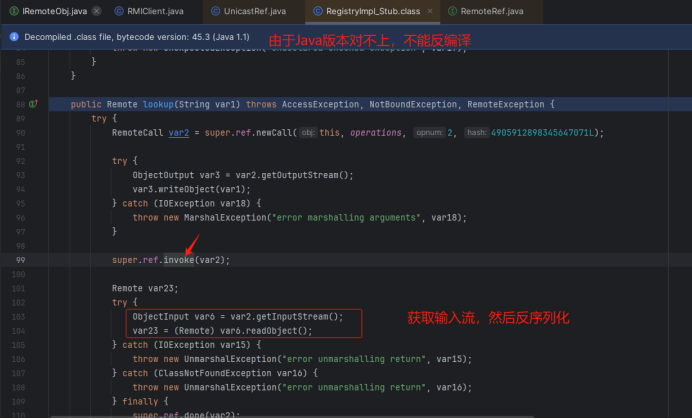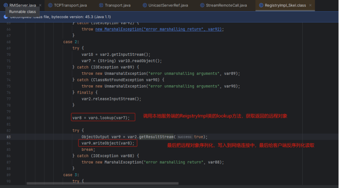 最后服务端本地调用 RegiistryImpl.lookup(name),获取返回的远程对象,最后远程对象序列化,然后还给客户端,让它进行反序列化读取