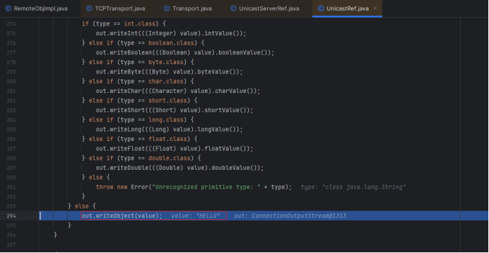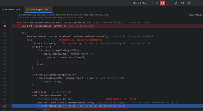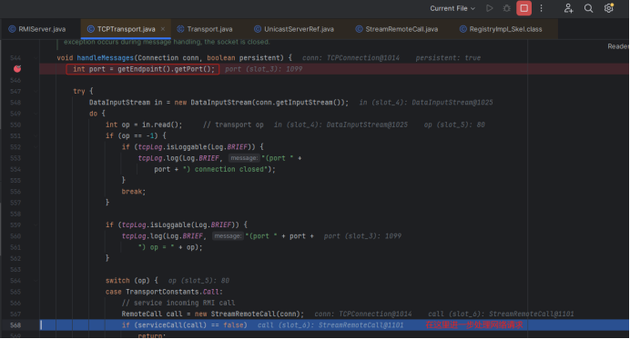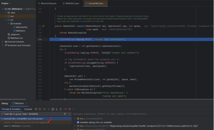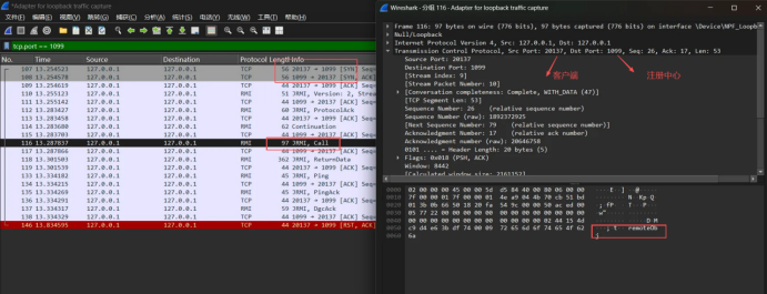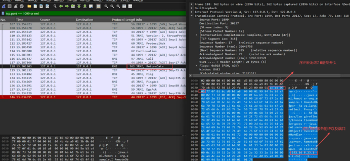 在客户端远程调Java程序的过程中其实建立了两次TCP连接,第一次连接是连接1099端口;第二次连接是由服务端发送给客户端的。