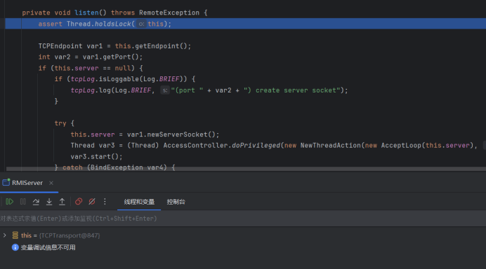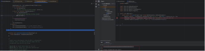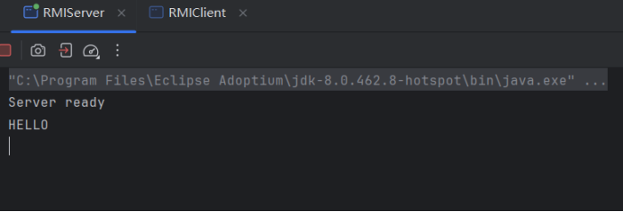 首先在RMIServer主程序运行,可以看到程序开始监听等待连接