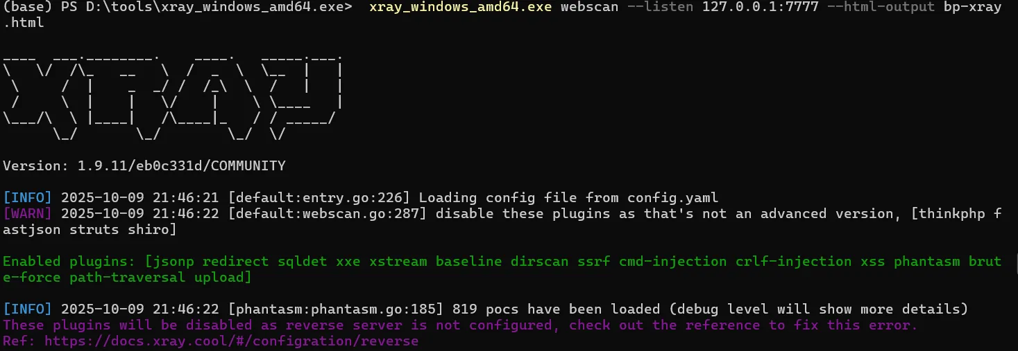 xray_windows_amd64.exe webscan --listen 127.0.0.1:7777 --html-output bp-xray.html